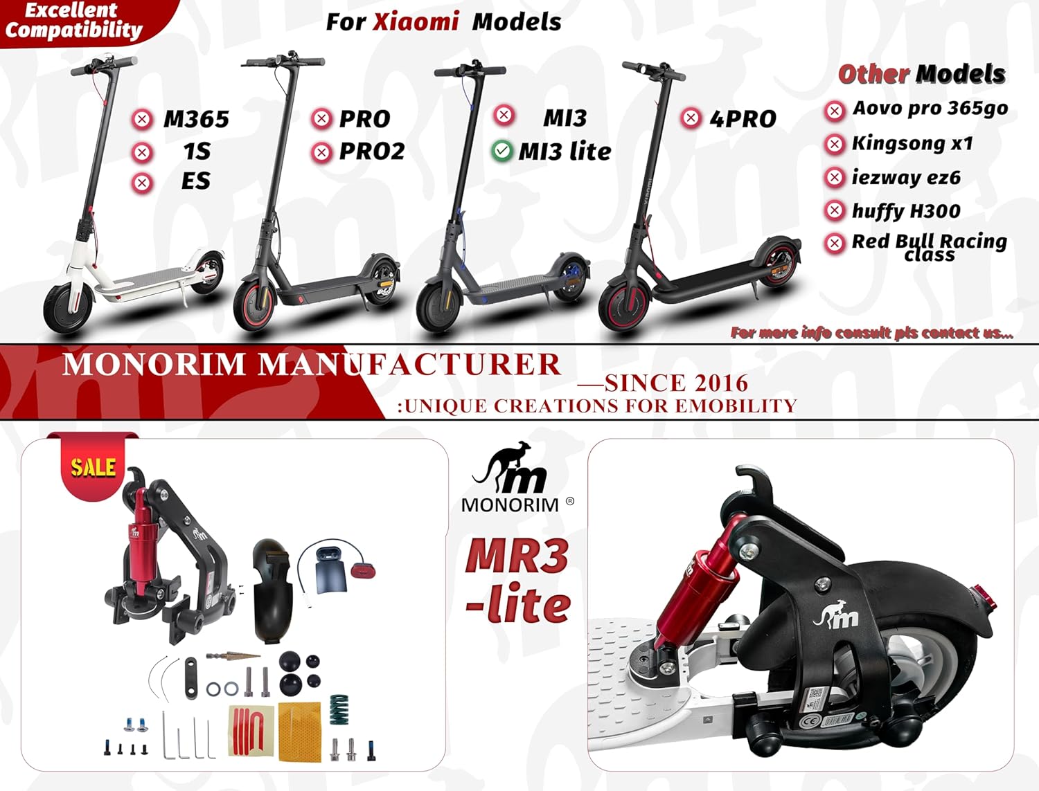 - Monorim MR3-lite suspension kit, compatible with Mi3 Lite electric scooters (Lite models only)